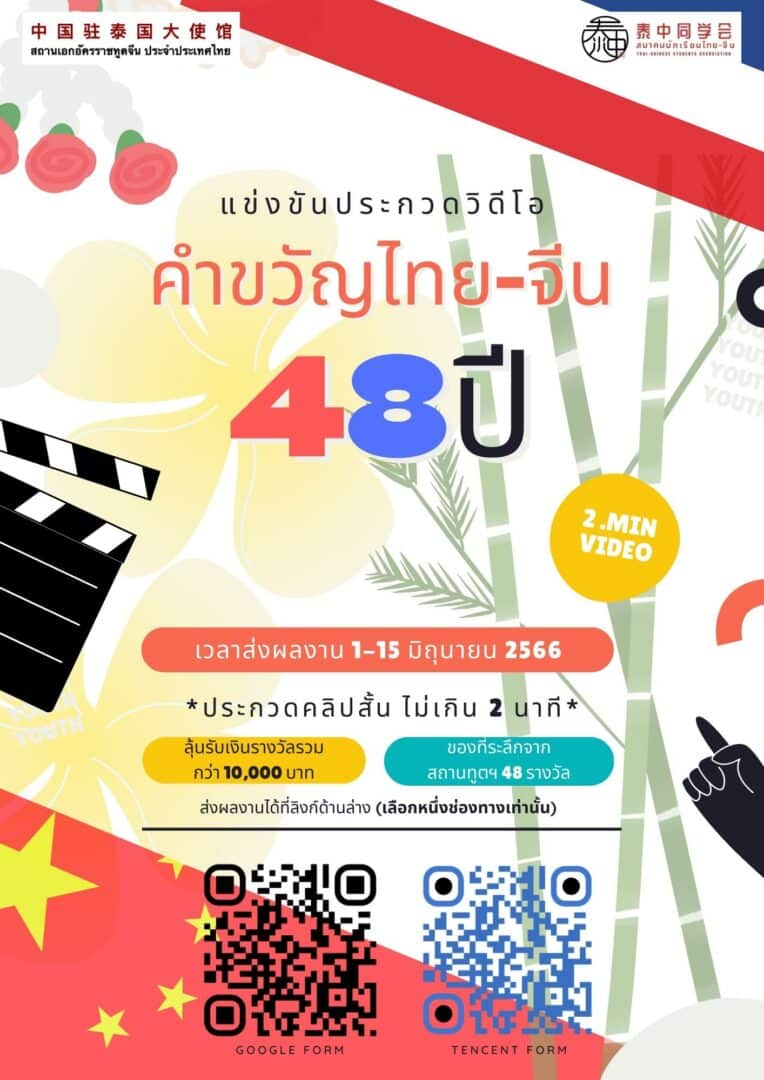 เชื่อมคำ เชื่อมใจ ไทย-จีน ผ่านการประกวดคลิปสั้น แต่งคำขวัญหัวข้อ “48 ปีแห่งความสัมพันธ์ดินแดนขวานทองและมังกรแดง” ในวันที่ 1 กรกฎาคม 2566