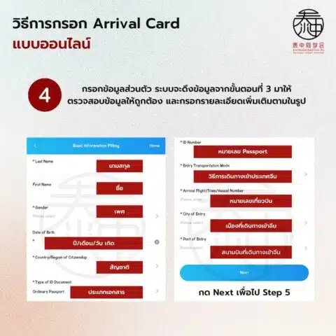 กรอกข้อมูลส่วนตัวเป็นภาษาอังกฤษให้ถูกต้อง ทุกอย่างต้องอ้างอิงตามหนังสือเดินทาง ในส่วนของช่องวิธีการเดินทางเข้า (Entry Transportation Mode) จะมีตัวเลือกดังนี้