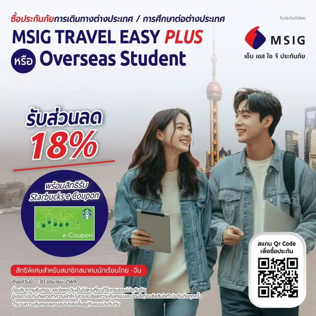 สมาคมนักเรียนไทย-จีน หวังเป็นอย่างยิ่งว่าทุกคนจะเรียนและท่องเที่ยวในจีนอย่างมีความสุข สำหรับใครที่ยังไม่มีประกันการเดินทาง สมาคมฯ ขอนำเสนอแผนประกันราคาย่อมเยาว์จาก MSIG ประกันภัย พาร์ทเนอร์ของสมาคมนักเรียนไทย-จีนตั้งแต่ก่อตั้งสมาคม พร้อมรับส่วนลด 18% และ Starbuck eCoupon